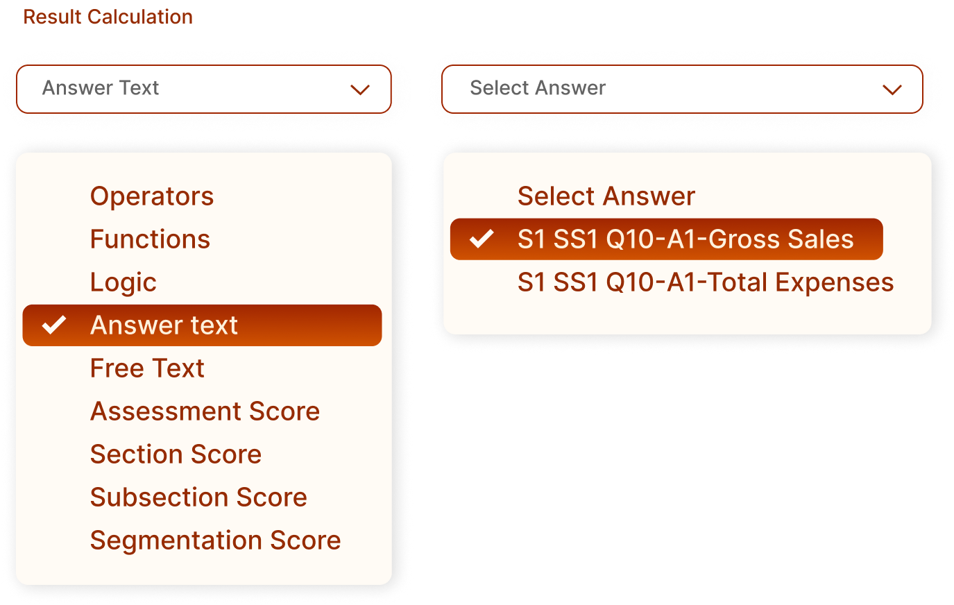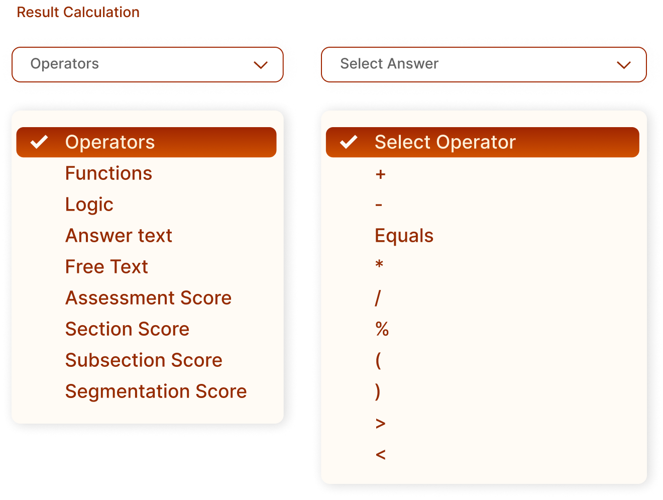 Just like standard assessment questions, calculations can be conditional, associated with segmentations and report text can be defined for when a score is calculated on a results page or feedback report.