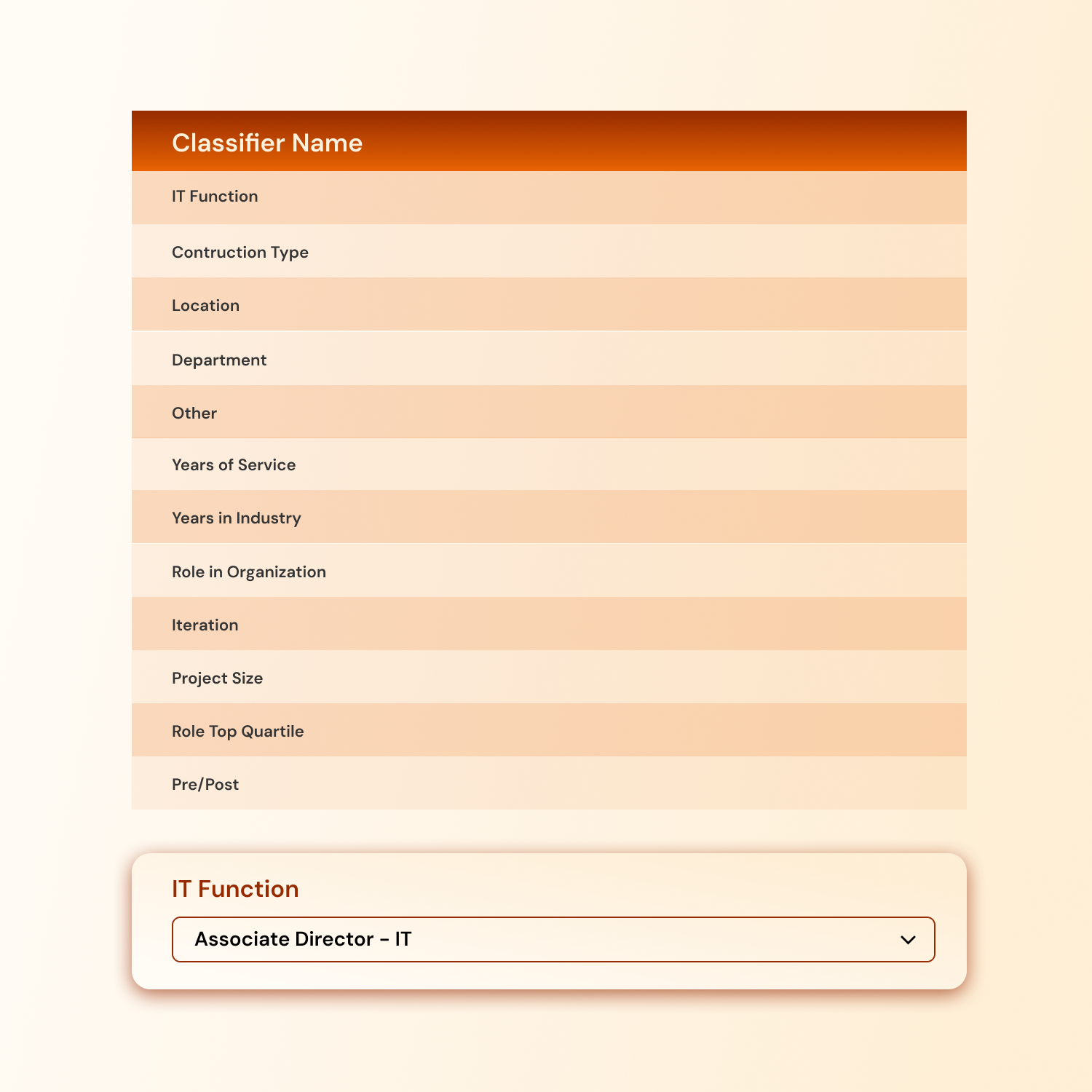 Classifiers allow you to categorize responses within a cohort, making it easier to segment and analyze specific groups. Common classifiers include department, role, years of service, or seniority. In reports, you can cross-reference and compare different classifiers to identify patterns or inconsistencies.