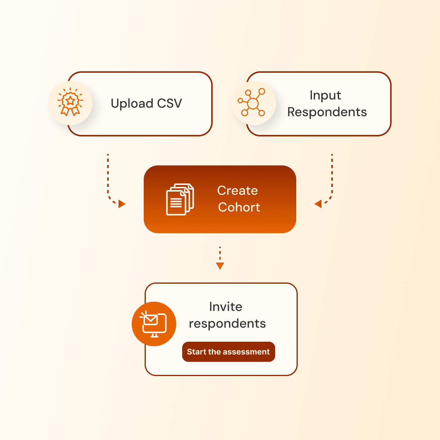 Administrators can use CSV Upload or enter respondent details to create cohorts for subjects. Automated emails are sent to respondents, inviting them to complete the assessment.