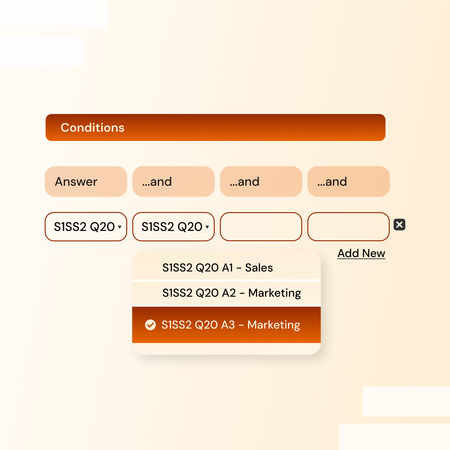 With conditions, administrators can control the flow of questions based on prior answers. This feature enables both “And” and “Or” logic, allowing custom paths to show only the most relevant questions to each respondent.