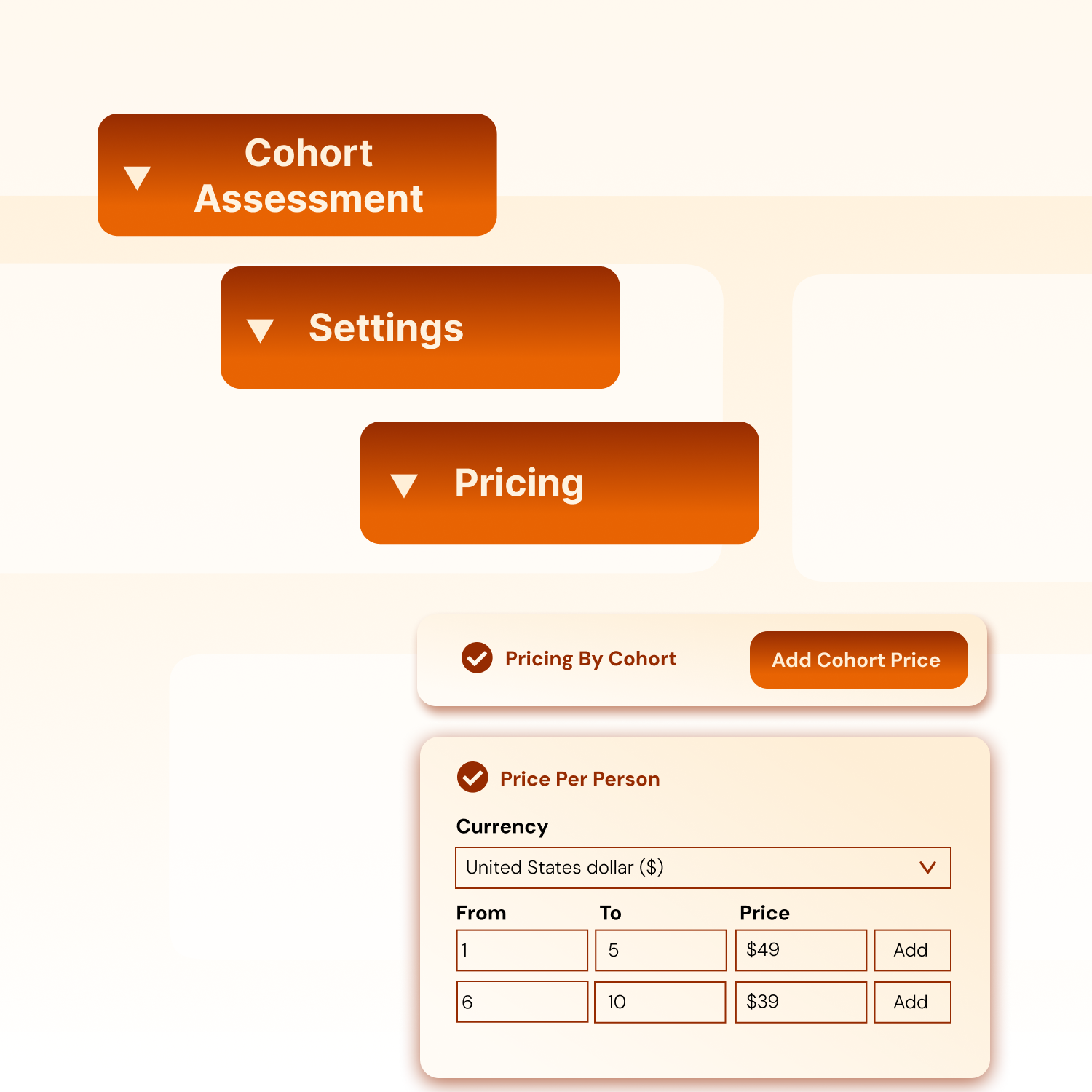There are different ways to monetize cohorts. Cohort assessments can be charged at a fixed rate for the cohort or a per-respondent price. It is also possible to set pricing bands based on the number of people in a cohort.